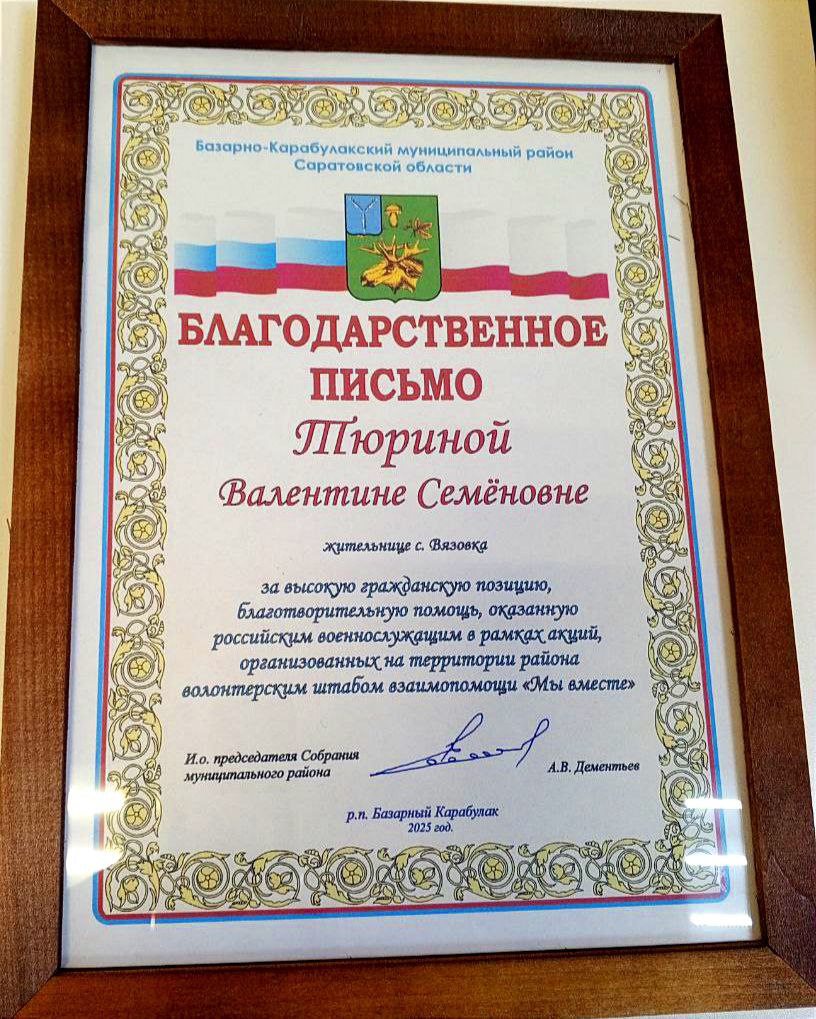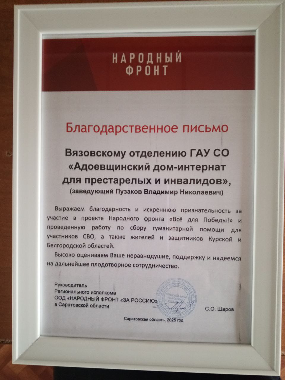 Сегодня на мероприятии, посвящённом Всемирному Дню волонтёра, ГАУ СО "Адоевщинский дом - интернат" (Вязовское отделение) был отмечен благодарственным письмом за участие в проекте Народного фронта "Все для Победы! " и проведённую работу по сбору гуманитарной помощи для участников СВО, а так же жителей и защитников Курской и Белгородской областей. Сотрудники дома - интерната плетут сети, изготавливают окопные свечи, вяжут носки для наших бойцов, выполняющих задачи специальной военной операции. Особую гордость испытываем за психиатра Вязовского отделения Валентину Семеновну Тюрину. Сегодня она отмечена Благодарственным письмом за высокую гражданскую позицию, благотворительную помощь, оказанную российским военнослужащим. Мы знаем,  что такая поддержка сегодня очень важна для наших солдат, поэтому такая работа будет продолжаться!