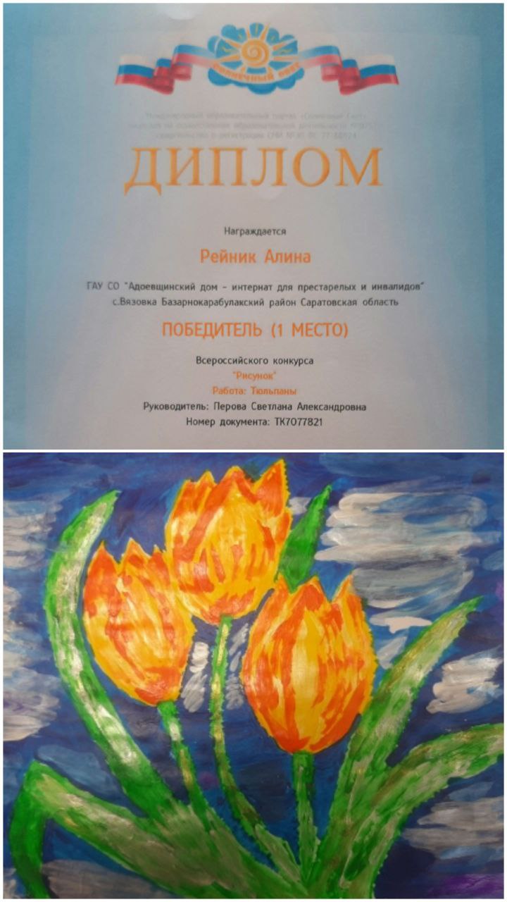 Рейник А. и Тютюник П., наши получатели социальных услуг,  стали участниками межрегионального конкурса, организованного  Международным  образовательным порталом "Солнечный свет". Обе работы были удостоены Дипломов победителя (1 место). Поздравляем наших участников с победой и желаем им новых творческих успехов, вдохновения и достижений. 👏👏👏