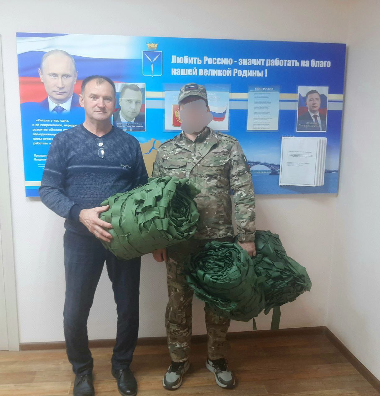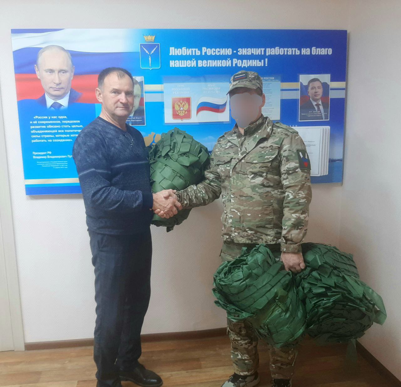 В ходе встречи бойцу были переданы маскировочные сети с пожеланиями скорейшего возвращения домой и с победой!